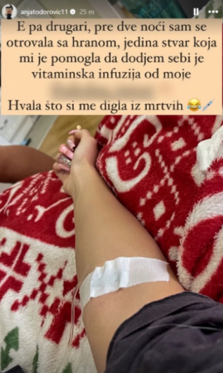 – E pa drugari, pre dve noći sam se otrovala sa hranom, jedina stvar koja mi je pomogla da dođem sebi, je vitaminska infuzija me je digla iz mrtvih – napisala je Anja Todorović na Instagramu.