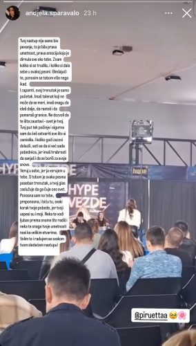 – Ne dozvoli da te išta zaustavi – svet je tvoj. Tvoj put tek počinje i sigurna sam da ćeš ostvariti sve što si zamislila. I koliko god izazovi dolazili, seti se da si već sada pobednica, jer imaš hrabrosti da sanjaš i da se boriš za svoje snove. Veruj u sebe, jer ja verujem u tebe. S tobom je svaka pesma poseban trenutak, a tvoj glas zaslužuje da ga čuje ceo svet. Ponosna sam na tebe, preponosna, i biću tu, svaki korak tvoje pobede, jer tvoji uspesi su i moji. Neka te vodi lubav prema onome što radis i neka te snaga tvoje umetnosti nosi ka velikim stvarima. Volim te i radujem se svakom tvom sledećem nastupu! – napisala je Anđela.