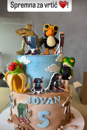 Torta na dva sprata bila je ukrašena figurama omiljenih crtanih junaka, dok su na vrhu plavim slovima bila ispisana njegova ime i broj pet.