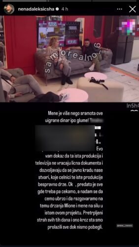 „Evo vam dokaza da ista ta produkcija i televizija ne vraćaju lična dokumenta. I dozvoljavaju da se javno kradu naše stvari, koje čelnici te iste produkcije bespravno drže. Okej, predato je sve gde treba pa čekamo. A nadam se da ćemo uskoro da razgovaramo na temu držanja mene i Mione na silu u istom ovom projektu. Pretrpljeni strah svih tih dana i ono kroz šta smo prošli dok nismo pobegli…“, napisao je Aleksić.