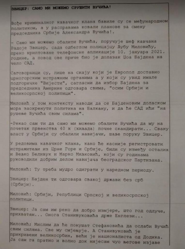 Sagovornici su, piše na skaju koju je Evropol dostavio crnogorskim istražnim organima a, u koji su uvid imale podgoričke „Vijesti“, saglasni da izbor Bajdena za predsednika Amerike odgovara svima, osim Srbiji i velikosrpskoj politici“.
