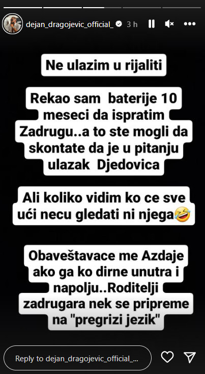 Dejan Dragojević se hitno oglasio se na društevnim mrežama i otkrio da li ulazi u rijaliti.