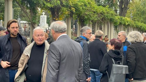 Vuk Drašković stigao je na Novo Groblje u crnom mantilu. Novinarka Tanja Peternek takođe je došla da se oprosti od reditelja.