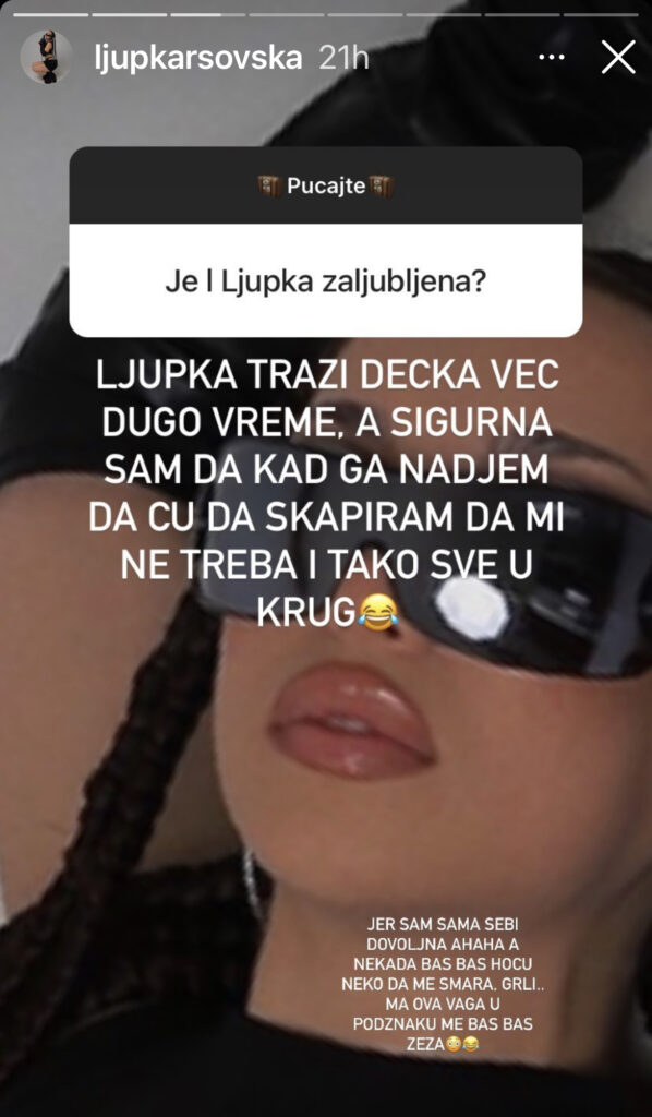 – Ljupka traži dečka već dugo, a sigurna sam da, kad ga nađem, skapiraću da mi ne treba i tako sve u krug – našalila se ona i dodala: