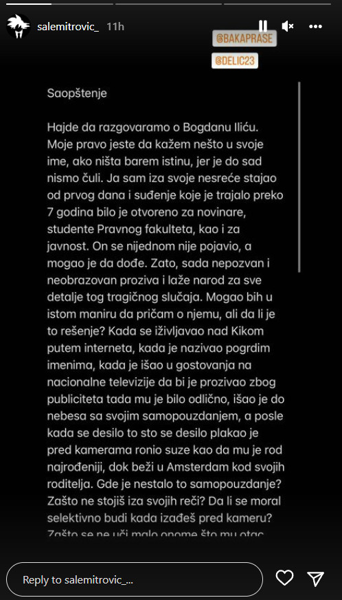 – Saopštenje, hajde da razgovaramo o Bogdanu Iliću. Moje pravo jeste da kažem nešto u svoje ime, ako ništa barem istinu, jer je do sada nismo čuli. Ja sam iza svoje nesreće stajao od prvog dana i suđenje koje je trajalo preko 7 godina bilo je otvoreno za novinare, studente Pravnog fakulteta, kao i za javnost. On se nijednom nije pojavio, a mogao je da dođe. Zato, sada nepozvan i neobrazovan, proziva i laže narod za sve detalje tog tragičnog slučaja. Mogao bih u istom maniru da pričam o njemu, ali da li je to rešenje? Kada se iživljavao nad Kikom putem interneta, kada je nazivao pogrdnim imenima, kada je išao u gostovanja na nacionalne televizije da bi je prozivao zbog publiciteta, tada mu je bilo odlično, išao je do nebesa sa svojim samopouzdanjem, a posle, kada se desilo to što se desilo, plakao je pred kamerama, ronio suze, kao da mu je rod najrođeniji, dok beži u Amsterdam kod svojih roditelja. Gde je nestalo to samopouzdanje? Zašto ne stojiš iza svojih reči? Da li se moral selektivno budi kada izađeš pred kameru? – naveo je Aleksandar.