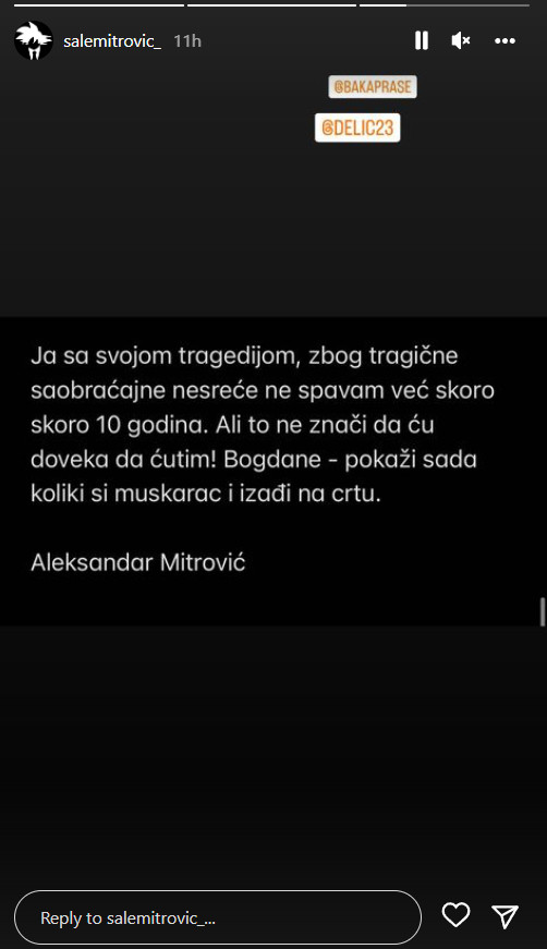 – Ja sa svojom tragedijom, zbog tragične saobraćajne nesreće, ne spavam već skoro 10 godina. Ali, to ne znači da ću doveka da ćutim! Bogdane, pokaži sada koliki si muškarac i izađi na crtu. Aleksandar Mitrović – zaključio je.