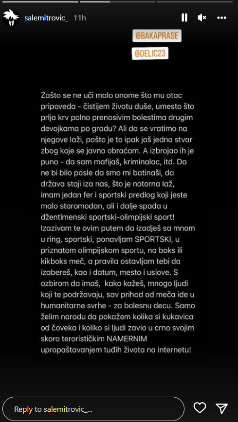 Influenser Baka Prase, iliti Bogdan Ilić, i čelnik „Pinka“ Željko Mitrović danima unazad vode medijski rat, oglašavajući se non-stop na društvenim mrežama. Nakon što je Bogdan u storijima na Instagramu pisao i o Mitrovićevom sinu Aleksandru, Željkov naslednik je osetio potrebu da se javno oglasi.
