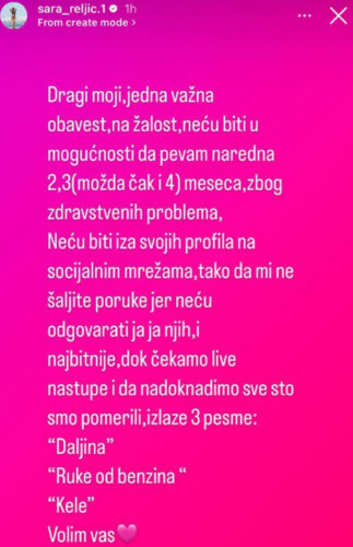 – Dragi moji, jedno važno obaveštenje, nažalost, neću biti u mogućnosti da pevam naredna 2,3 (možda čak i 4) meseca, zbog zdravstvenih problema – napisala je Sara i dodala: