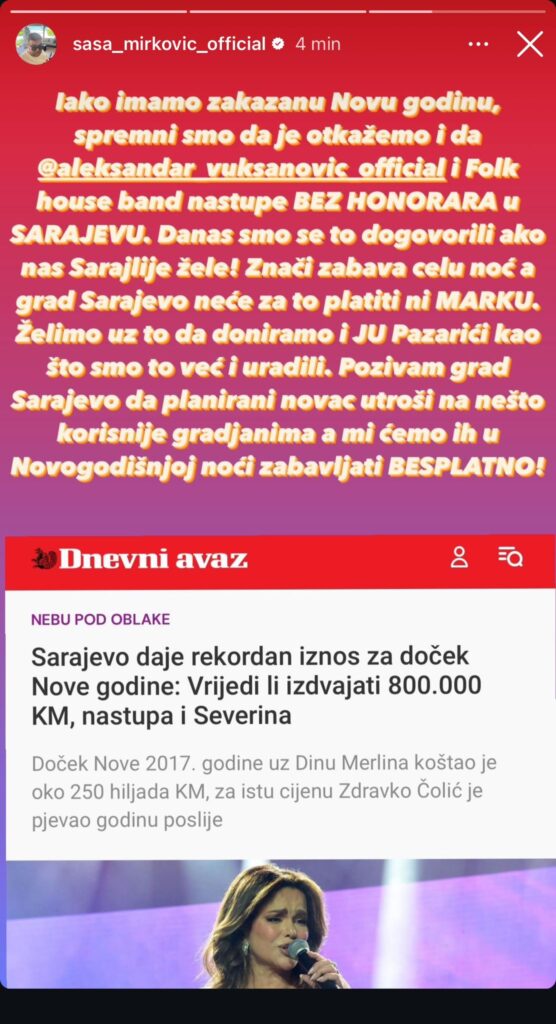 – Iako imamo zakazanu Novu godinu, spremni smo da je otkažemo i da Aca Lukas i Folk house band nastupe BEZ HONORAHA U SARAJEVU. Danas smo se to dogovorili, ako nas Sarajlije žele! Znači zabava celu noć, a grad Sarajevo neće za to platiti ni MARKU. Želimo uz to da doniramo i JU Pazarići kao što smo to već i uradili. Pozivam grad Sarajevo da planirani novac utroši na nešto korisnije građanima, a mi ćemo ih u Novogodišnjoj noći zabavljati BESPLATNO! – napisao je u svom postu Saša Mirković.