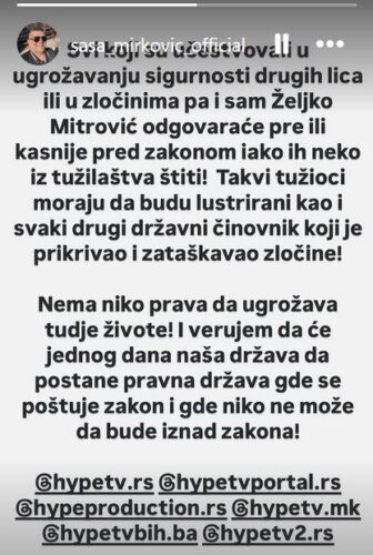 -Svi koji su učestvovali u ugrožavanju sigurnosti drugih lica ili zločinima, pa u sam Željko Mitrović… Ogovaraće pre ili kasnije pred zakonom iako ih neko štiti iz tužilaštva. Takvi tužioci moraju da budu lustrirani kao i svaki drugi državni činovnik. Svako ko je prikrivao i zataškavao zločine – poručio je direktor Hype imerije pa je dodao: