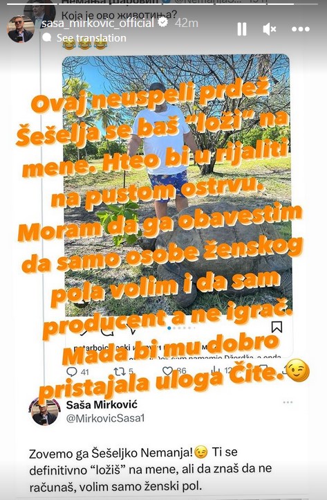 – Ovaj neuspeli pr*ež Šešelja se baš „loži“ na mene. Hteo bi u rijaliti na pustom ostrvu. Moram da ga obavestim da samo osobe ženskog pola volim i da sam producent, a ne igrač. Mada bi mu dobro pristajala uloga Čite – napisao je Saša.
