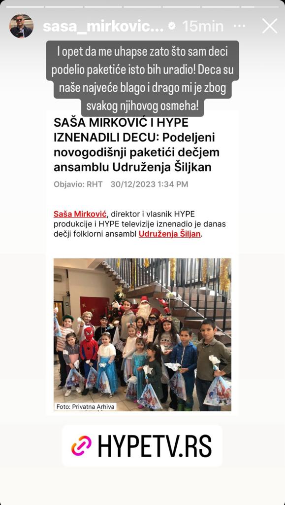 „I opet da me uhapse zato što sam deci podelio paketiće isto bih uradio! Deca su naše najveće blago i drago mi je zbog svakog njihovog osmeha!“- napisao je Mirković.