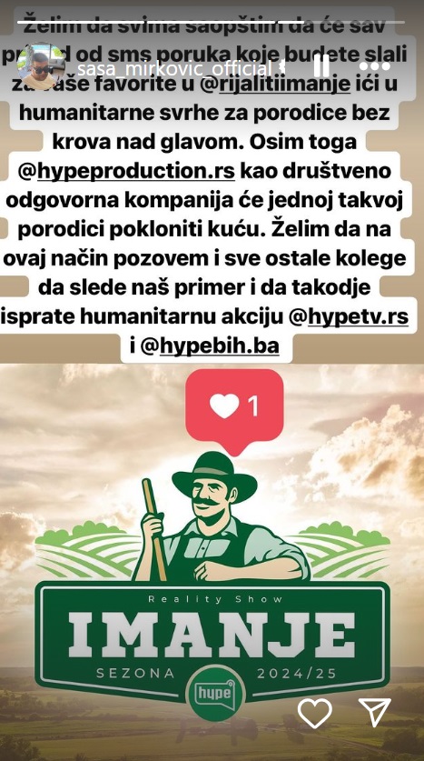 -Želim svima da saopštim da će sav prihod od sms poruka koje budete slali za vaše favorite u rijalitiju „Imanje“ ići u humanitarne svrhe za porodice bez krova nad glavom – započeo je Saša Mirković, pa otkrio dalje: