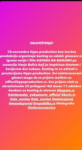 „Desetog novembra Hype production kao izvršna produkcija organizuje kasting odabir glumaca za igranu seriju i film „Kafana na Balkanu“, po scenariju Vanje Bulića koji je inspirisan životom i karijerom Ace Lukasa. Kasting će se održati u prostorijama Hype produkcije.