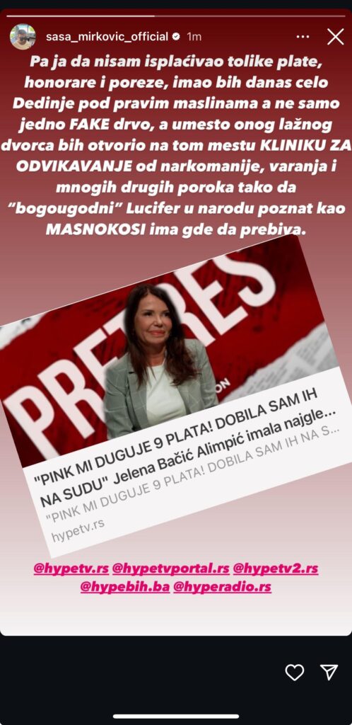 -Ja da nisam isplaćivao tolike plate, honorare i poreze imao bih danas celo Dedinje. I to pod pravim maslinama, a ne samo jedno fake drvo. A umesto lažnog dvorca otvorio bin na tom mestu kliniku za odvikavanje od narkomanije varanja i mnogih drugih poroka! Tako da „bogoumni“ Lucifer u narodu poznat kao Masnokosi ima gde da prebiva. – istakao je Saša Mirković.- poručuje direktor Hype televizije i dodaje: