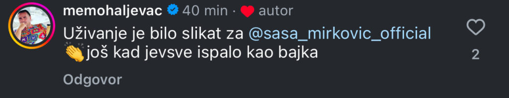 “Uživanje je bilo slikati za Sašu Mirkovića, još kad je sve ispalo kao bajka…”., odgovorio je Memo u komentaru.