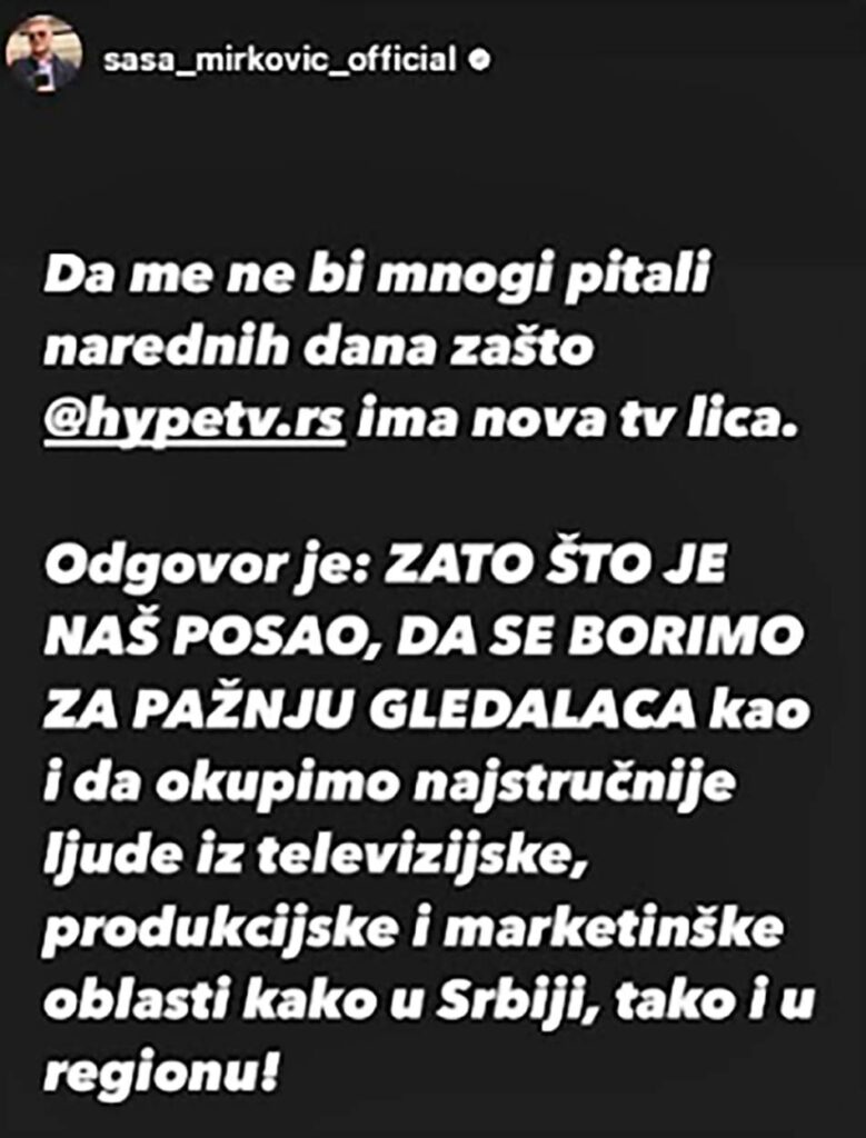 „Da me ne bi mnogi pitali narednih dana zašto Hajp Tv ima nova lica. Odgovor je: Zato što je naš posao da se borimo za pažnju gledalaca kao i da okupimo najstručnije ljude iz televizijske, produkcijske i marketinške oblasti, kako u Srbiji tako i u regionu!„- glasila je objava