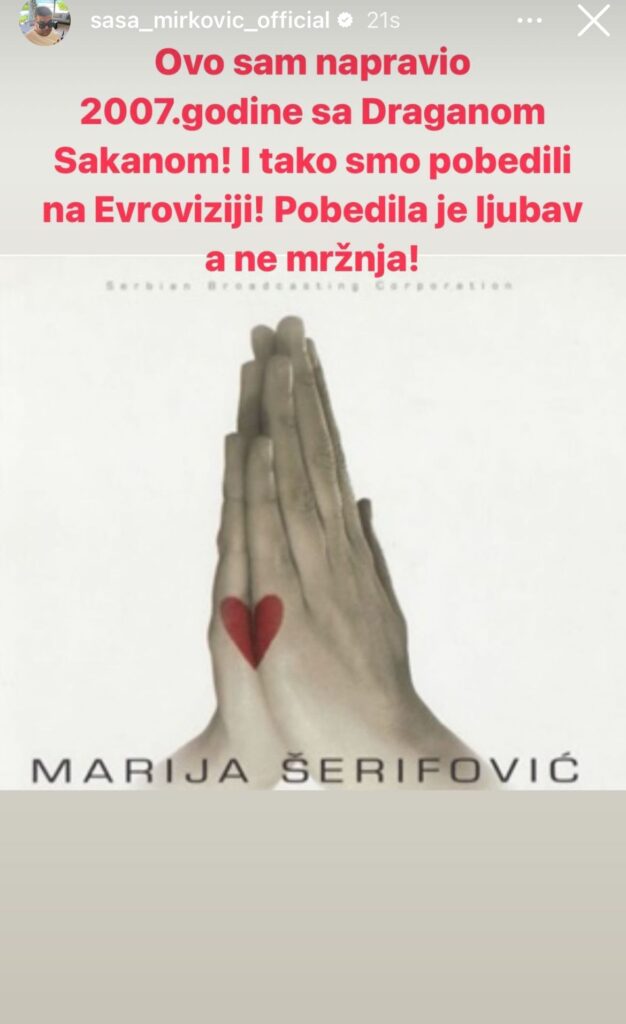 „Ovo sam napravio 2007. godine sa Draganom Sakanom. I tako smo pobedili na Evroviziji! Pobedila je ljubav, a ne mržnja“, glasi opis Mirkovićevog storija. Na istom možemo videti ruke koje se mole i pozivaju na mir, što je bila i poenta numere pod nazivom „Molitva“.