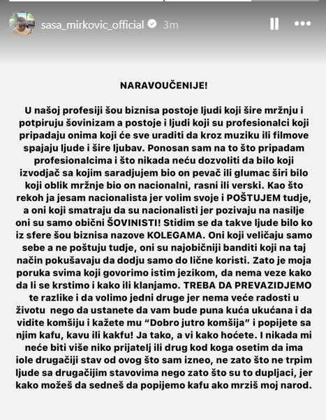 „Bio on nacionalni, rasni ili verski. Kao što rekoh ja jesam nacionalista jer volim svoje i POŠTUJEM tuđe. A oni koji smatraju da su nacionalisti jer pozivaju na nasilje oni su samo obični ŠOVINISTI! Stidim se da takve ljude bilo ko iz sfere šou biznisa nazove KOLEGAMA”, nastavio je, između ostalog, Mirković.