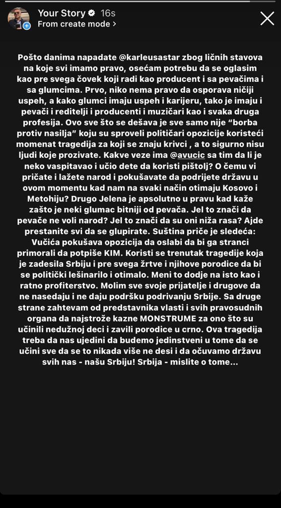 -Pošto danima napadate Jelenu Karleušu zbog ličnih stavova na koje svi imamo pravo, osećam potrebu da se oglasim kao pre svega čovek koji radi kao producent i sa pevačima i sa glumcima. Prvo, niko nema pravo da osporava ničiji uspeh, a kako glumci imaju uspeh i karijeru, tako je imaju i pevači i reditelji i producenti i muzičari kao i svaka druga profesija. Ovo sve što se dešava je sve samo nije „borba protiv nasilja“ koju su sproveli političari opozicije koristeći momenat tragedija za koji se znaju krivci, a to sigurno nisu ljudi koje prozivate. Kakve veze ima Aleksandar Vučić sa tim da li je neko vaspitavao i učio dete da koristi pištolj? O čemu vi pričate i lažete narod i pokušavate da podrijete državu u ovom momentu kada nam na svaki način otimaju Kosovo i Metohiju? Drugo Jelena je apsolutno u pravu kad kaže da pevače ne voli narod? Jel to znači da su oni niža rasa? Ajde prestanite svi da se glupirate. Suština priče je sledeća: Vučića pokušava opozicija da oslabi da bi ga stranci primorali da potpiše KiM. Koristi se trenutak tragedije koja je zadesila Srbiju i pre svega žrtve i njihove porodice da bi se politički lešinarilo i otimalo. Meni to dođe na isto kao i ratno profiterstvo. Molim sve svoje prijatelje i drugove da ne nasedaju i ne daju podršku podrivanju Srbije. Sa druge strane zahtevam od predstavnika vlasti i svih pravosudnih organa da najstrože kazne MONSTRUME za ono što su učinili nedužnoj deci i zavili porodice u crno. Ova tragedija treba da nas ujedini da budemo jedinstveni u tome da se učini sve da se to nikada više ne desi i da očuvamo državu svih nas – našu Srbiju! Srbija – mislite o tome…
