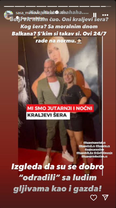 Ovim povodom na svom zvaničnom Instagram profilu oglasio se i vlasnik i direktor Hype produkcije i televizije Saša Mirković, te prokomentarisao ove navode.
