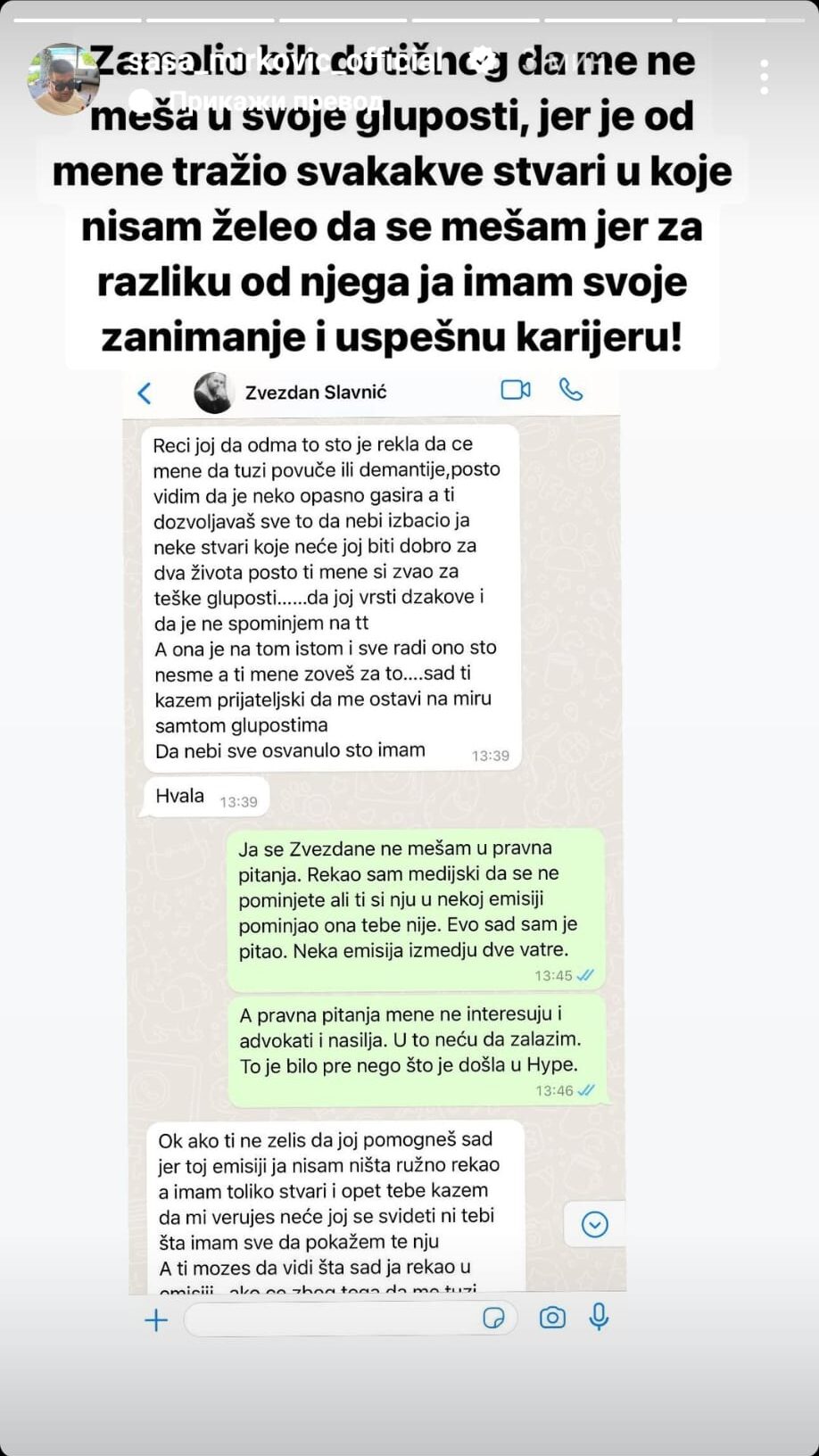 -Reci joj odmah to što je rekla da će da me tuži povuče ili demantuje, pošto vidim da je neko opasno gasira, a ti dozvoljavaš sve to, da ne bi ja izbacio neke stvari, neće joj biti dobro za dva života, pošto si ti mene zvao za teške gluposti. Da joj vratim džakove i da je ne spominjem na TikToku, a ona je na tom istom i sve radi što ne sme, a ti mene zoveš za to. Sad ti kažem prijateljski da me ostavi na miru sa tim glupostima, da ne bi sve osvanulo što imam. Hvala- napisao je Zvezdan, govoreći o Anđeli Đuričić, koja je do nedavno bila zapošljena na Hype televiziji.