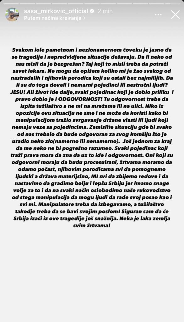 „Svakom iole pametnom i nezlonamernom čoveku je jasno da se tragedije i nepredviđene situacije dešavaju. Da li neko od nas misli da je bezgrešan? Taj koji to misli treba da potraži savet lekara. Ne mogu da opišem koliko mi je žao svakog od nastradalih i njihovih porodica koji su ostali bez najmilijih. Da li su do toga doveli i nemarni pojedinci ili nestručni ljudi? JESU! Ali život ide dalje, svaki pojedinac koji je dobio priliku i pravo dobio je i ODGOVORNOST! Tu odgovornost treba da ispita tužilaštvo, a ne mi na mrežama ili na ulici. Niko iz opozicije ovu situaciju ne sme i ne može da koristi kako bi manipulacijom tražio svrgavanje državne vlasti ili ljudi koji nemaju veze sa pojedincima. Zamislite situaciju gde bi svako od nas trebalo da bude odgovoran za svog komšiju što je uradio neko zlo (namerno ili nenamerno).