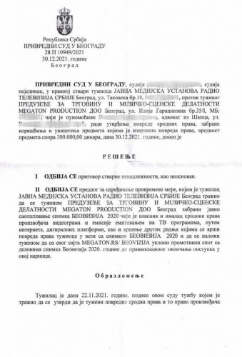 Saša Mirković je sudski dokazao da je vlasnik Beovizije produkcijska kuća „Megaton“ na čijem je on čelu, a ne Javni servis. Osim toga, sud je odbio privremenu meru koju je tražio RTS, a to je zahtev da se zabrani „Megatonu“ da koristi promotivni spot Beovizije 2020.