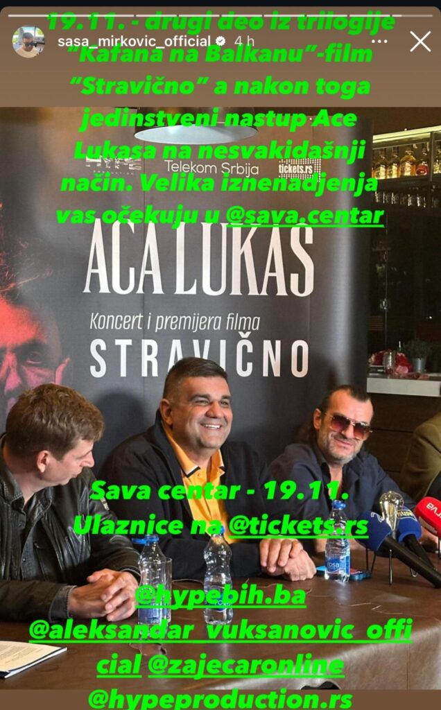 – 19.11. – drugi deo iz trilogije „Kafana na Balkanu“ – film „Stravično“, a nakon toga jedinstveni nastup Ace Lukasa na nesvakidašnji način. Velika Iznenađenja vas očekuju u Sava Centru! – napisao je Saša Mirković!