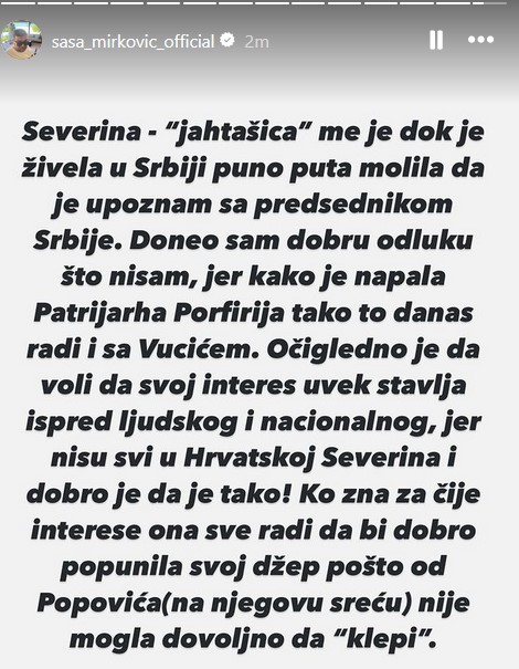 Srbije. Doneo sam dobru odluku što nisam, jer kako je napala Patrijarha Porfirija tako to danas radi i sa Vučićem. Očigledno je da voli da svoj interes uvek stavlja ispred ljudskog i nacionalnog, jer nisu svi u Hrvatskoj Severina i dobro je da je tako! Ko zna za čije interese ona sve radi da bi dobro popunila svoj džep. Pošto od Popovića (na njegovu sreću) nije mogla dovoljno da „klepi“ – piše u objavi.