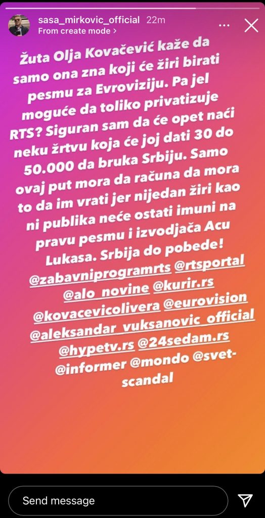 – Žuta Olja Kovačević kaže da samo ona zna koji će žiri birati pesmu za Evroviziju. Pa jel’ moguće da toliko privatizuje RTS? Siguran sam da će opet naći neku žrtvu koja će joj dati 30-50.000 evra da bruka Srbiju. Samo ovaj put mora da računa, da ni žiri ni publika neće ostati imuni na pravu pesmu i pravog izvođača Acu Lukasa. Srbija do pobede! – piše na storiju Saše Mirkovića.