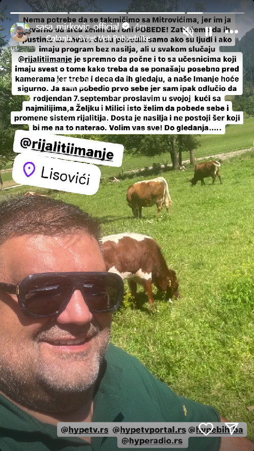– Nema potrebe da se takmičimo sa Mitrovićima, jer im ja stvarno od srca želim da i oni POBEDE! Zato ćemo da ih pustimo da shvate da su pobedili samo ako su ljudi i ako imaju program bez nasilja, ali u svakom slučaju rijaliti „IMANJE“ je spremno da počne i to sa učesnicima koji imaju svest o tome kako treba da se ponašaju posebno pred kamerama jer treba i deca da ih gledaju, a naše „IMANJE“ hoće sigurno. Ja sam pobedio prvo sebe jer sam ipak odlučio da rođendan 7. septembra proslavim u svojoj kući sa najmilijima, a Željku i Milici isto želim da pobede sebe i promene sistem rijaltija. Dosta je nasilja i ne postoji šer koji bi me na to naterao. Volim vas sve! Do gledanja… – napisao je Saša Mirković.