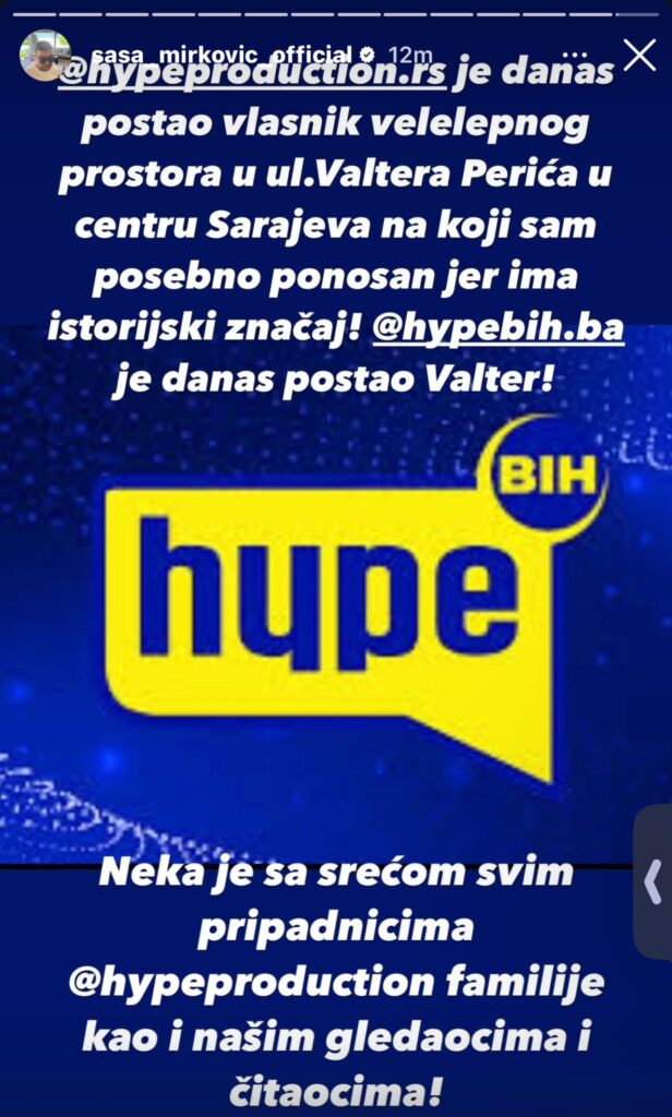 -Hype production je danas postao vlasnik velelepnog prostora u ul. Valtera Perića u centru Sarajeva na koji sam posebno ponosan jer ima istorijski značaj! Hype BiH je danas postao Valter! – napisao je vlasnik i direktor Hype produkcije i Hype televizije.