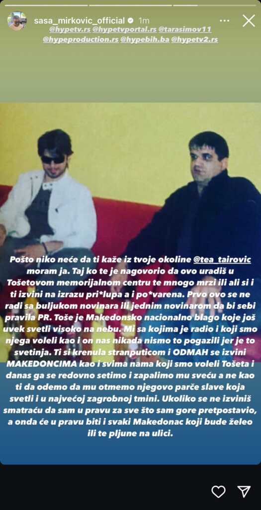 – Taj ko te je nagovorio da ovo uradiš u Tošetovom memorijalnom centru te mnogo mrzi. Ali si i ti, izvini za izrazu, pri*lupa i po*varena. Prvo ovo se ne radi sa buljukom novinara ili jednim novinarem, da bi sebi pravila PR. Toše je makedonsko nacionalno blago koje još uvek svetli visoko na nebu. Mi sa kojima je radio i koji smo njega voleli, kao i on nas, nikada nismo to pogazili. Jer je to svetinja.