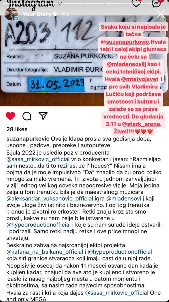 – Saša Mirković vrlo konkretan i jasan: “Razmišljao sam nešto… da ti to režiraš. Je l’ hoćeš?” Nisam imala pojma da je moje impulsivno “Da” značilo da ću proći toliko mnogo za malo vremena. Tri života u jednom zahvaljujući viziji jednog velikog čoveka nepogrešive vizije. Moja jedina želja u tom trenutku bila je da maestralnog muzičara Acu Lukasa igra Mladen Sovilj koji svoje uloge živi istinito i bezrezervno. I od tog trenutka krenuo je životni rolerkoster. Retki znaju kroz šta smo prošli, kakve su nam želje bile i stvarne u Hype produkciji i koje su nam sulude ideje ostvarili i podržali. Samo retki nađu retke i ove priče mnogi ne shvataju. Beskrajno zahvalna najsretnijoj ekipi projekta “Kafana na Balkanu” i Hype produkciji koja širi granice stvaraoca koji imaju čast da u njoj rade. Neopisiv je osećaj da nakon 11 meseci osvane dan kada je kupljen kadar, znajući da sve što je kupljeno i stvoreno je izašlo iz našeg najboljeg mesta u datom momentu i okolnostima, sa našim tada najvećim sposobnostima. Hvala za rast i krila koja daješ Saša Mirković ONE AND ONLY MEGA – naglasila je Suzana Purković.