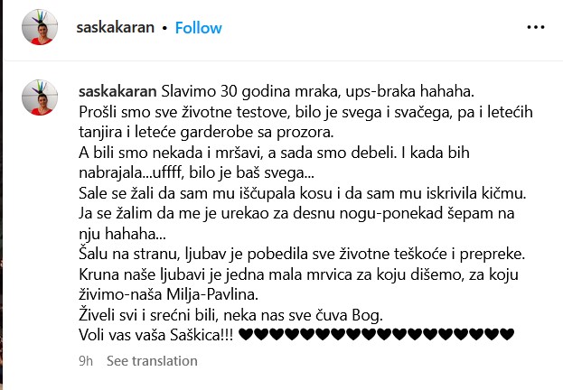 – Slavimo 30 godina mraka, ups-braka ha-ha-ha. Prošli smo sve životne testove, bilo je svega i svačega, pa i letećih tanjira i leteće garderobe sa prozora. A bili smo nekada i mršavi, a sada smo debeli. I kada bih nabrajala uf, bilo bi još svega. Sale se šali da sam mu iščupala kosu i da sam mu iskrivila kičmu. Ja se žalim da me je urekao za desnu nogu-ponekad šepam na nju. Šalu na stranu, ljubav je pobedila sve životne teškoće i prepreke. Kruna naše ljubavi je jedna mala mrvica za koju dišemo, za koju živimo naša Milja Pavlina. Živeli svi i srećni bili, neka nas sve Bopg čuva. Voli vas vaša Saškica – napisala je pevačica na društvenim mrežama uz slike sa svečanog ručka.