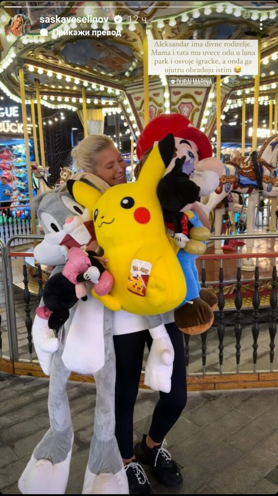 Na Instagramu je Saška podelila slike iz luna parka u Dubaiju, gde su se ona i Đorđe slikali s rukama punim igračaka koje su osvojili u zabavnom parku.