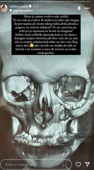 Šavija je objavila i na Instagram storiju i sliku svog lica i napisala da je od svih krila ali da je u tom periodu htela da izvrši suicid. Kao i da je imala tu misao 6 meseci.