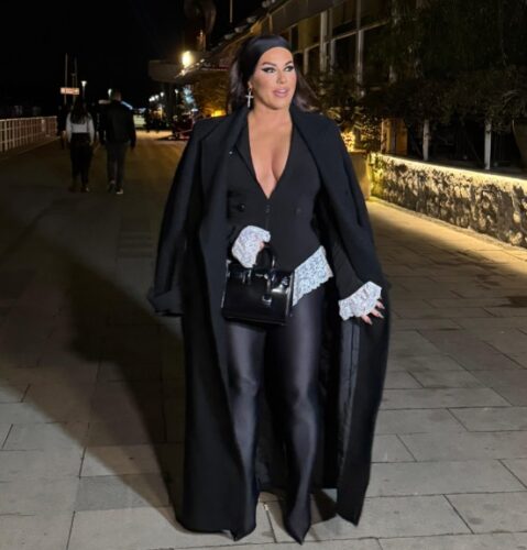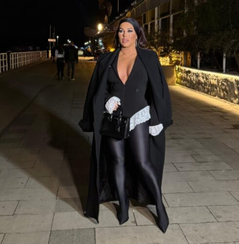 Za nastup je odabrala crnu provokativnu kombinaciju koja je istakla njen duboki dekolte, a tokom razgovora bila je vidno raspoložena, s osmehom na licu.