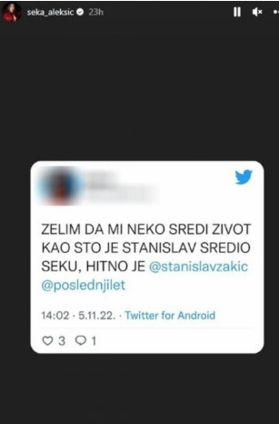 „Želim da mi neko sredi život kao što je Stanislav Zekić sredio Seku, hitno je“, stoji u objavi koja se očigledno toliko dopala pevačici da je odmah podelila na svom nalogu.