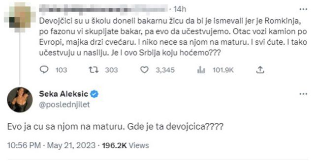 – Devojčici su u školu doneli bakarnu žicu da bi je ismevali jer je Romkinja, u smislu vi skupljate bakar, pa evo da učestvujemo. Otac vozi kamion po Evropi, a majka drži cvećaru. Niko ne želi s njom na maturu… I svi ćute! Tako učestvuju u nasilju. Je l’ ovo Srbija koju hoćemo? – glasila je objava.