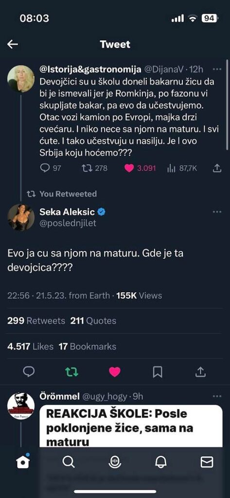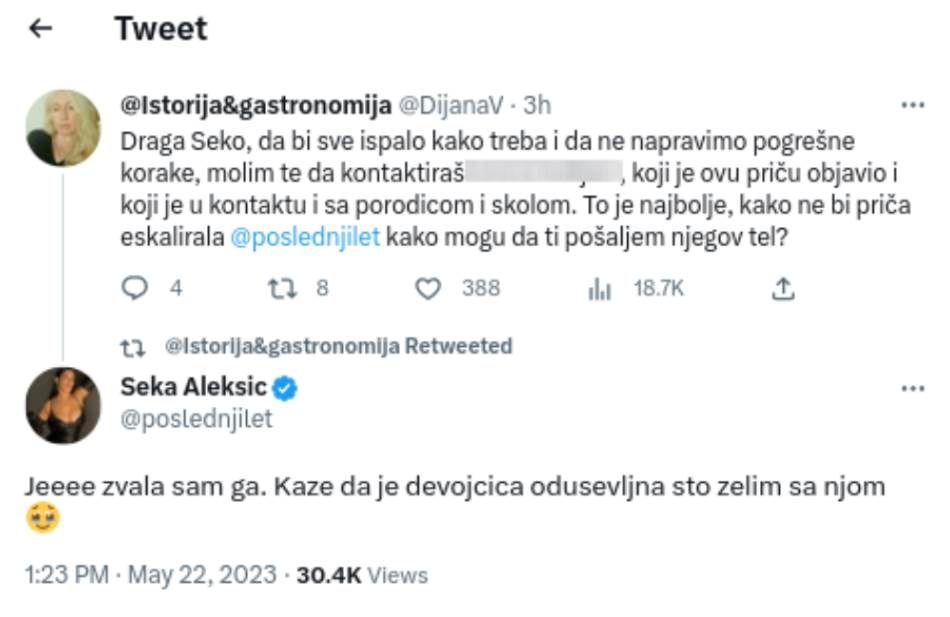 Reakcija popularne pevačice Seke Aleksić na ovu situaciju oduševila je celu naciju. Ona je javno izjavila da će ona biti pratnja devojčici na maturskom balu, a zatim je započela potragu za informacijama o devojčici kako bi mogla stupiti u kontakt s njom. Seka je sada otkrila jednoj korisnici na Twitteru da je uspela da stupi u kontakt s osobom koja je prva podelila priču, i da je devojčica oduševljena saznanjem da će joj Seka praviti društvo na maturi.
