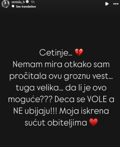 – Cetinje… Nemam mira otkako sam pročitala ovu groznu vest. Velika tuga. Da li je ovo moguće? Deca se vole, a ne ubijaju! Moje iskreno saučešće porodicama – napisala je Senidah, koja je ovaj strašan događaj duboko doživela.