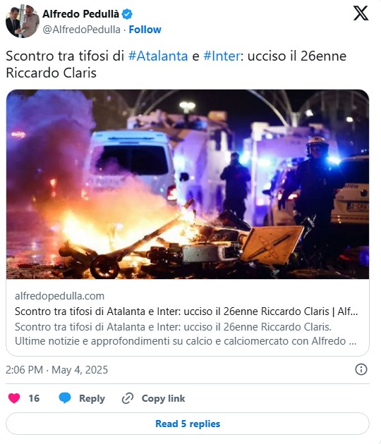 Rikardo Klaris (26), navijač Atalante iz Bergama usmrćen je nožem tokom brutalnog sukoba pristalica „boginje provincije“ i Intera!