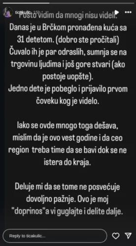 – Ovo je šokantna vest koja ne sme da prođe nezapaženo. Mislim da je ovo najvažnija vest godine i da ceo region treba da se bavi ovom situacijom dok se ne istraži do kraja. Ove stvari moraju da se iznese na svetlost dana i da se stane na kraj trgovini ljudima, bez obzira na sve. Deca su naša budućnost i ne smemo dozvoliti da bilo ko trpi ovakve torture – poručila je Tijana Kulić.