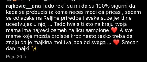 – Tado, rekli su mi da su 100 odsto sigurni da kada se probudiš iz kome nećeš moći da pričaš, sećam se odlazaka na Reljine priredbe i svake suze jer ti ne učistvuješ u njoj… Tado, hvala ti što na kraju tvoja mama ima najveći osmeh na licu, šampione. A, sve mame koje možda prolaze kroz nešto teško treba da znaju da je majkina molitva jača od svega… Srećan dan majki – napisala je Ana.