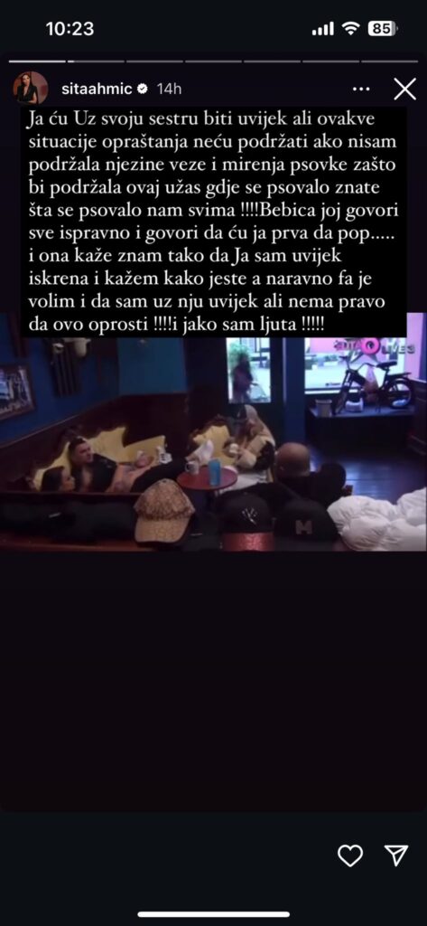 – Ja ću uz svoju sestru biti uvek, ali ovakve situacije opraštanja neću podržati, ako nisam podržala njene veze i mirenja, psovke, zašto bih podržala ovaj užas gde se psovalo znate šta se psovalo nama svima!!! Bebica joj govori sve ispravno i govori da ću ja prva da pop…i ona kažem znam. Tako da, ja sam uvek iskrena i kažem kako jeste, a naravno da je volim i da sam uz nju uvek. Ali nema pravo da ovo oprosti!!! I jako sam ljuta!!! – napisala je Sita na svom instagram profilu. I tako javno rekla šta misli o sestrinom potezu.