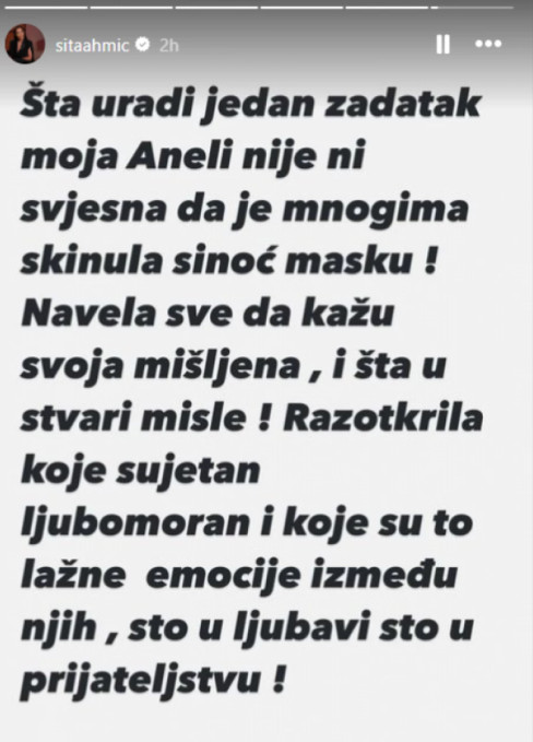 – Šta uradi jedan zadatak, moja Aneli nije ni svesna da je mnogima skinula sinoć masku! Navela sve da kažu svoja mišljenja i šta ustvari misle! Razotkrila ko je sujetan, ljubomoran i koje su to lažne emocije između njih, što u ljubavi, što u prijateljstvu! – poručila je Ahmićeva.