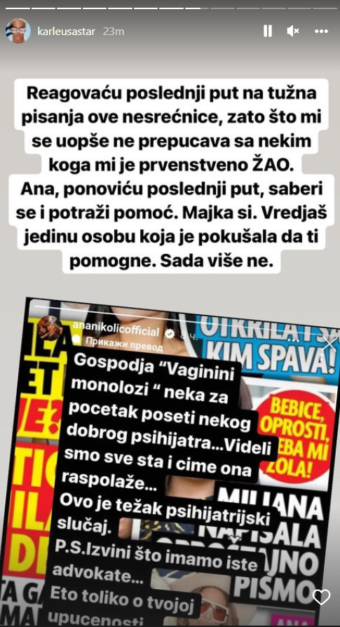 „Reagovaću poslenji put na tužna pisanja ove nesrećnice zato što mi se uopšte ne prepucava sa nekim koga mi je prvenstveno žao. Ana, ponoviću poslednji put, saberi se i potraži pomoć. Majka si. Vređaš jedinu osobu koja je pokušavala da ti pomogne. Sada više ne“, napisala je Jelena Karleuša.