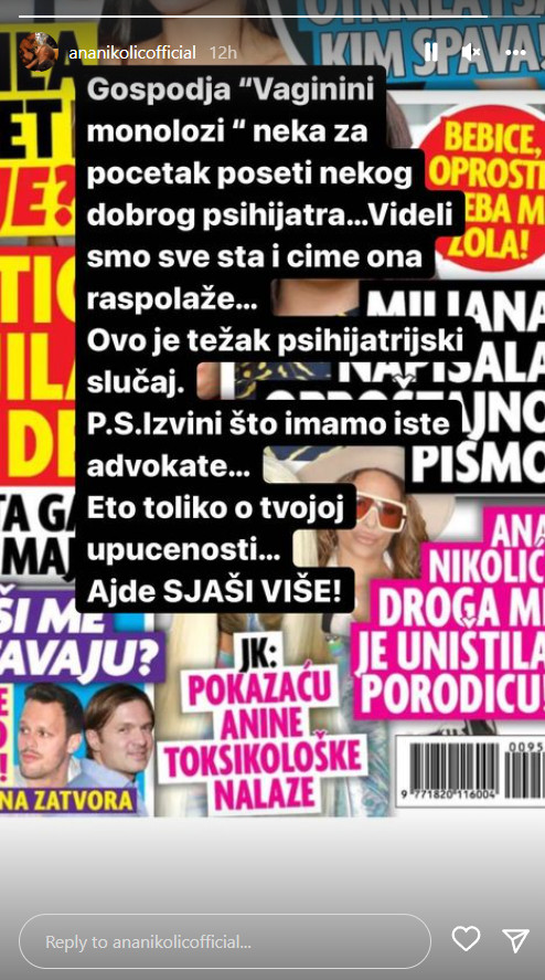 – Gospođa „vaginini monolozi“ neka za početak poseti nekog dobrog psihijatra. Videli smo sve šta i čime ona raspolaže. Ovo je težak psihijatrijski slučaj – napisala je na svom Instagram storiju Ana, pa zaključila: